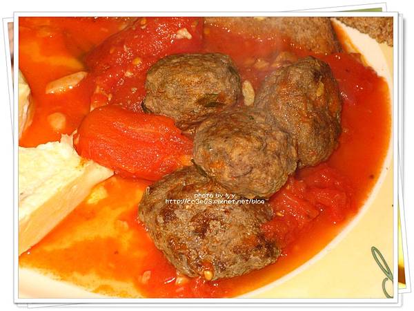 將番茄罐頭放入煮滾後,將牛肉丸加入一起煮至滾,加入少許的乾燥香料、海鹽及黑胡椒調味即可。