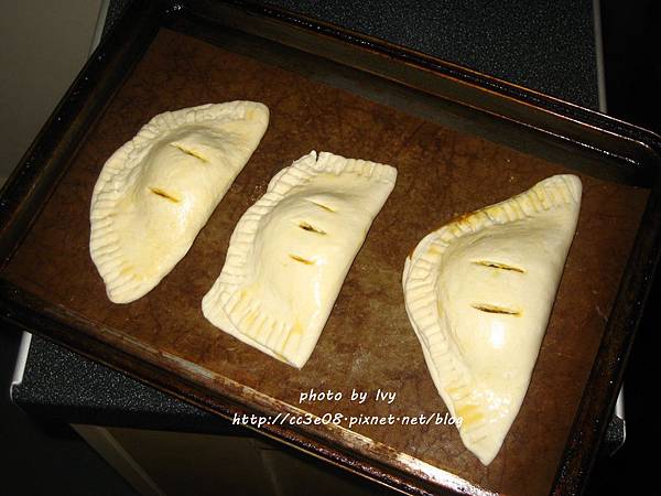 咖哩酥的三邊連接處用叉子壓出花紋,並用刀子在咖哩酥上劃上幾道,讓烤的時候熱氣能散出。