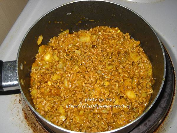 加入咖哩Paste與絞肉翻炒均勻後,放入蒜末及洋蔥丁,用少許的糖及鹽調味後,快速翻炒、關火,放在一旁等變涼。